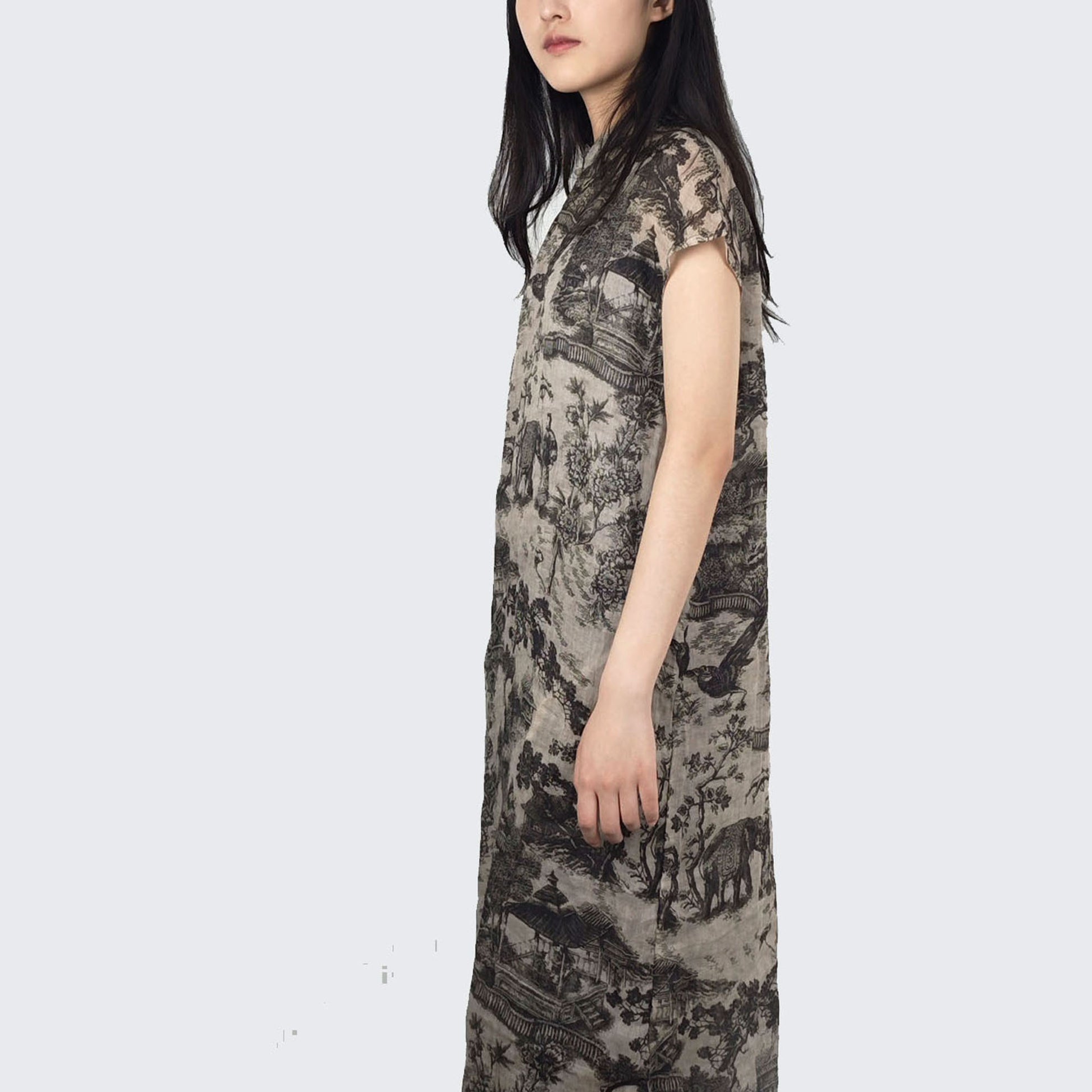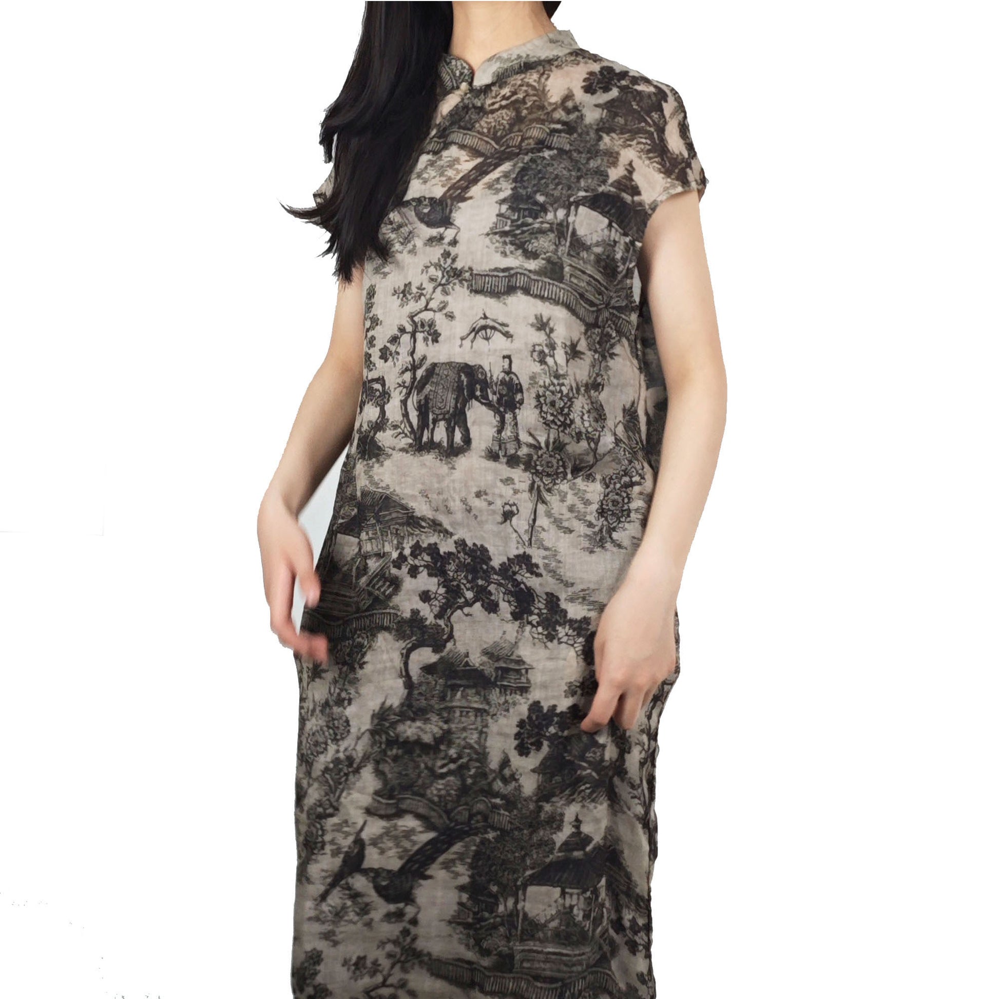 Chinese painting motif Ramie Qipao dress loose fit qipao dress modern fit qipao dress Ramie qipao