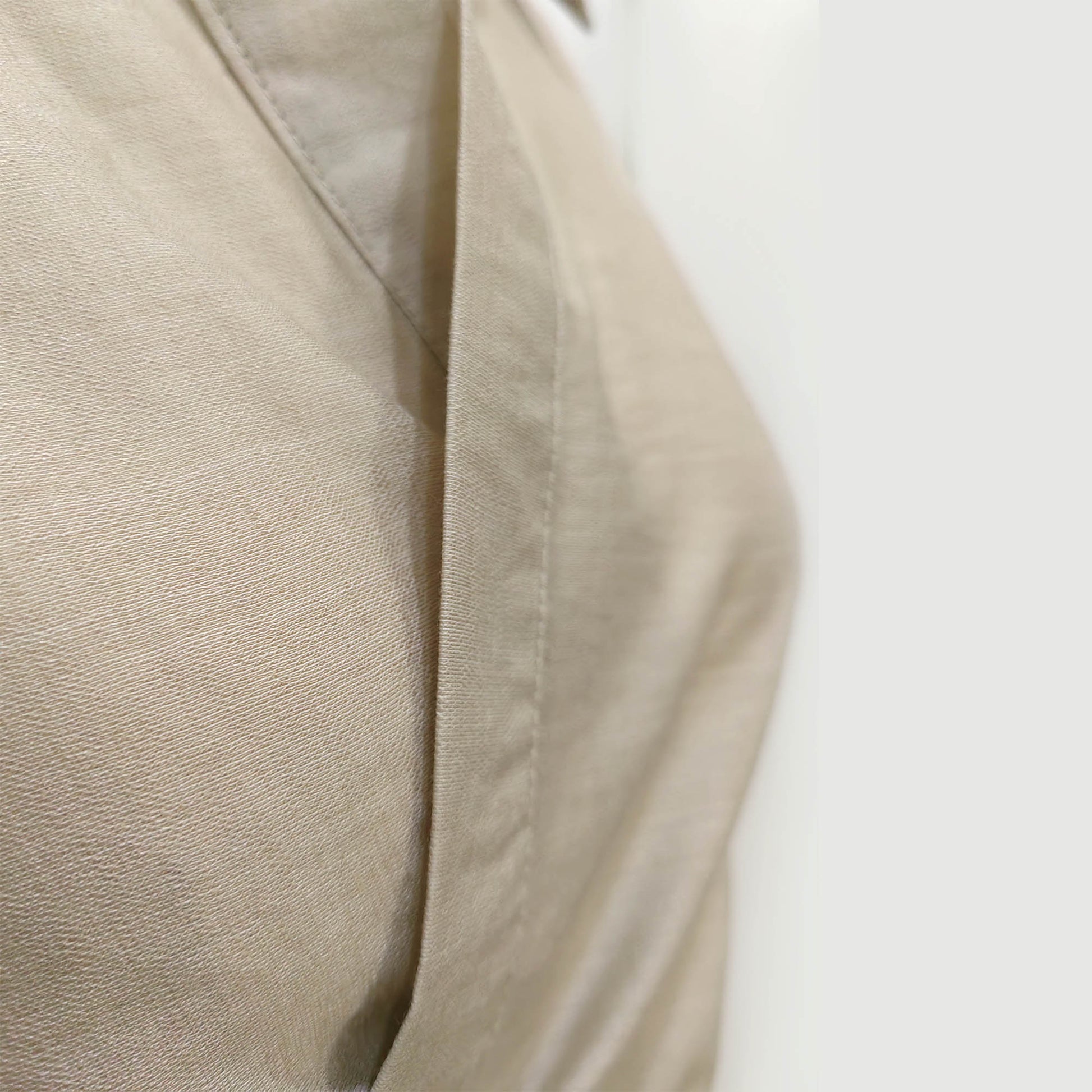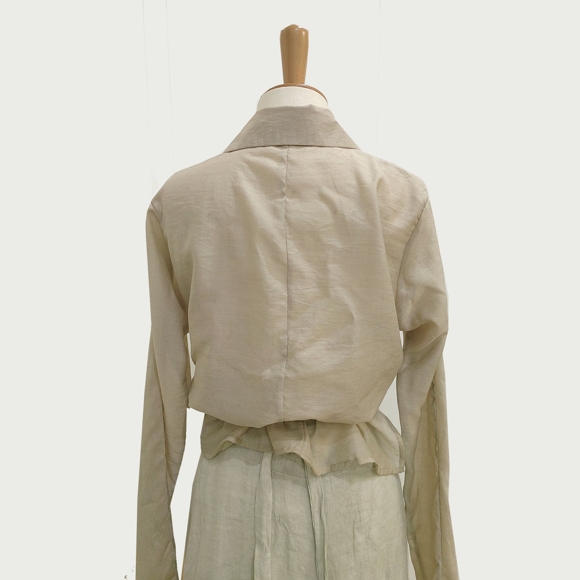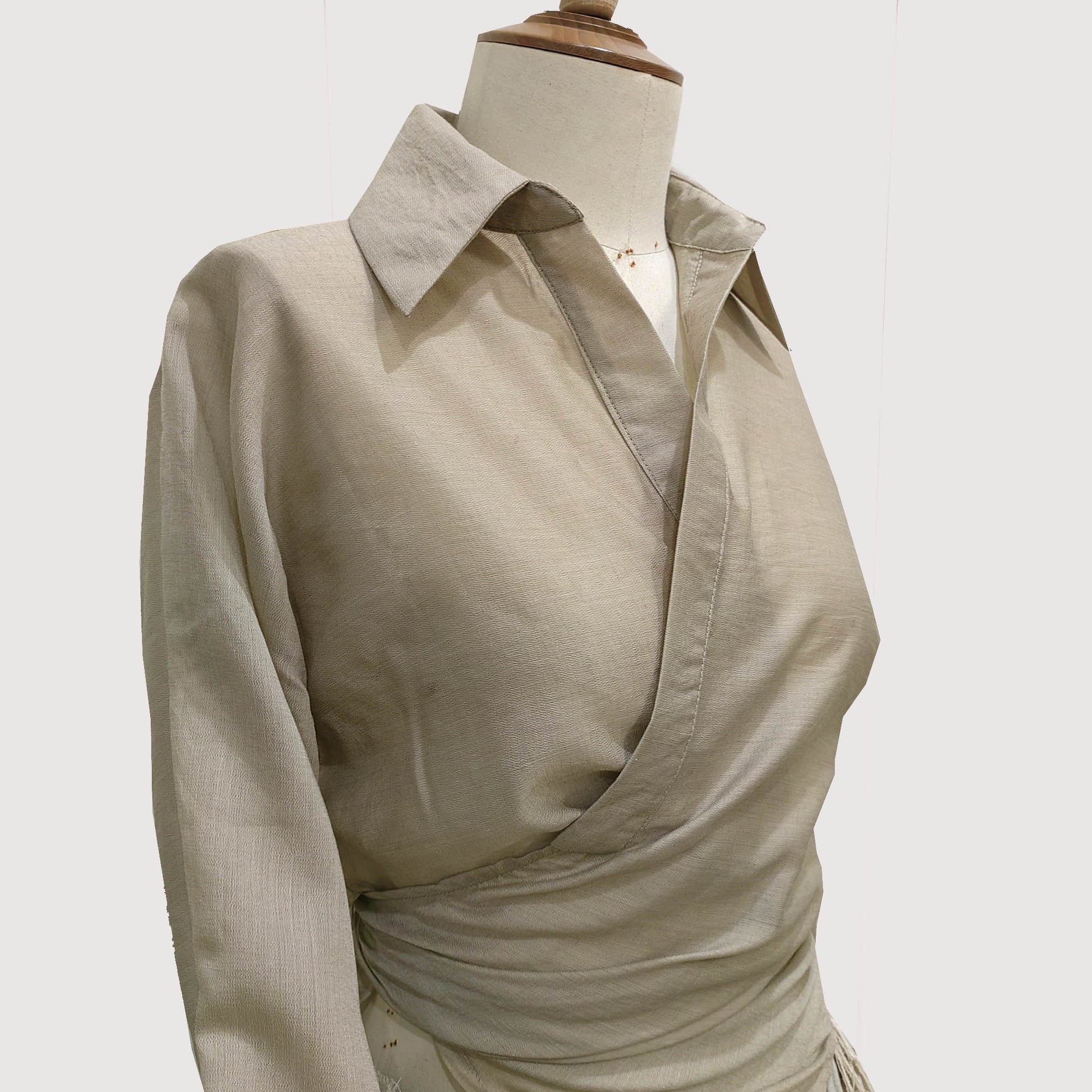 This top shirt is a deconstruction style overlap front and a hidden band at back waist to create the shirt look.