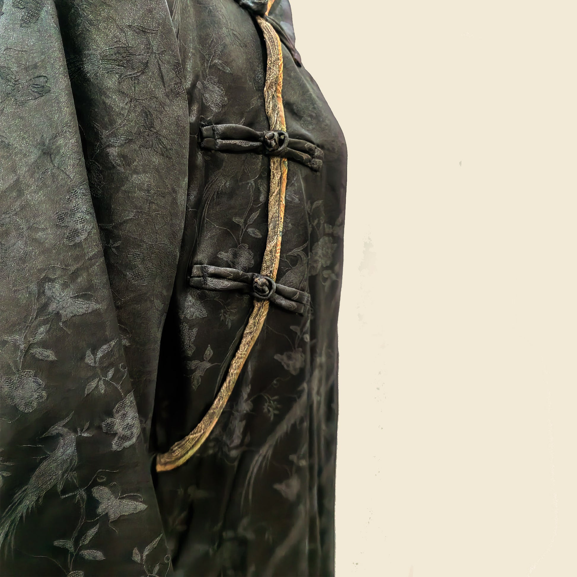 This Chinese Qipao style dress is made by gambiered Guangdong gauze silk.