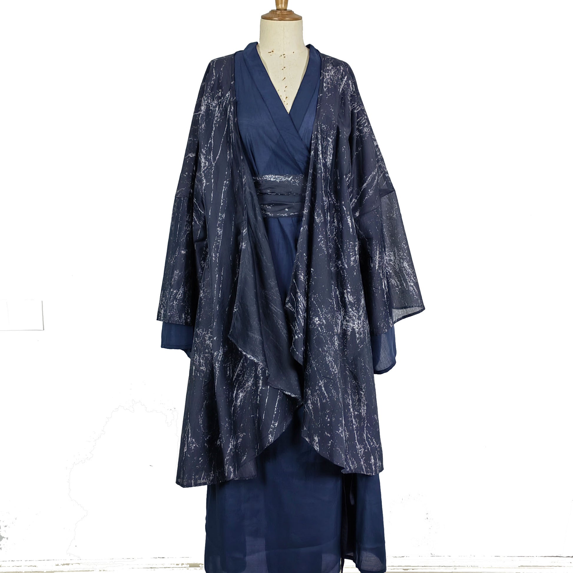 Hanfu, Haori, Blue Kimono 3PCS Set Japanese Style Robe Chinese Hanfu Dress Modified Hanfu Neza Studio Maxi Kimono Dress OBI belt Indigo