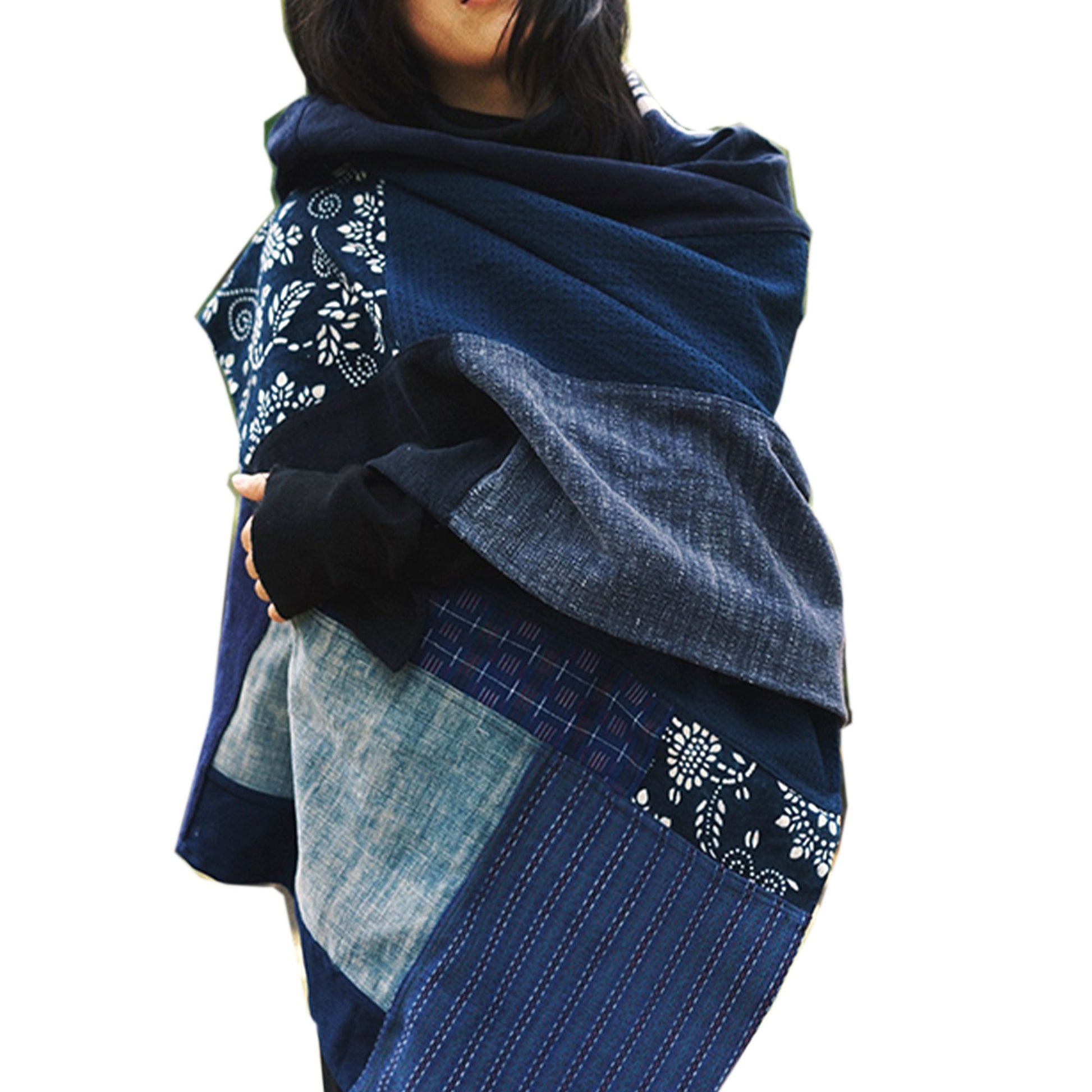 Large Patchwork scarf Indigo Blue shawl boro scarf Vintage Fabric Patch scarf women's scarf Hand Woven Fabric wrap hood blanket dark blue