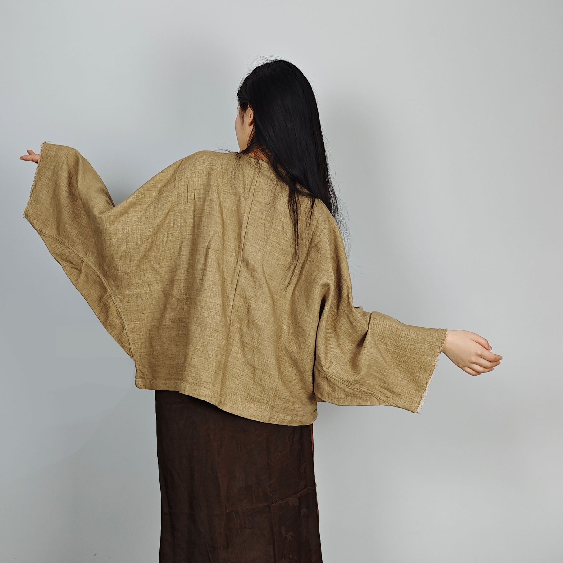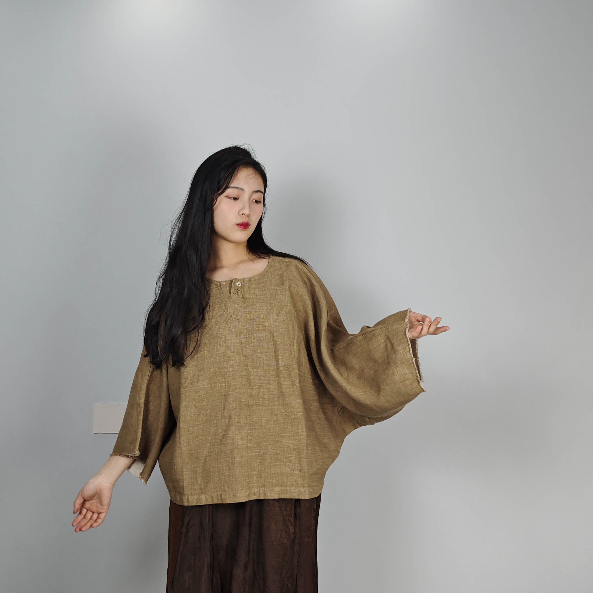 Linen top duel layer linen top with raw edge sleeves hem hand embroidery detail loose fit crop top comfy style linen top for women