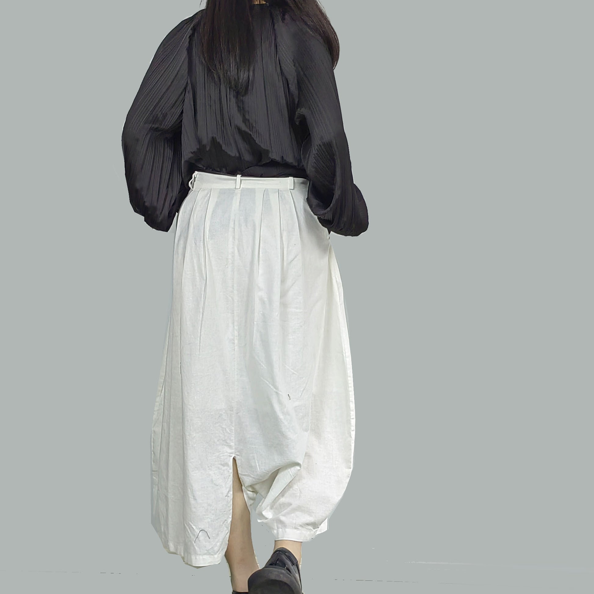 Round Shape Linen Cotton Pants White Linen Pants for women with black string decor Assymmetric Shape Trousers