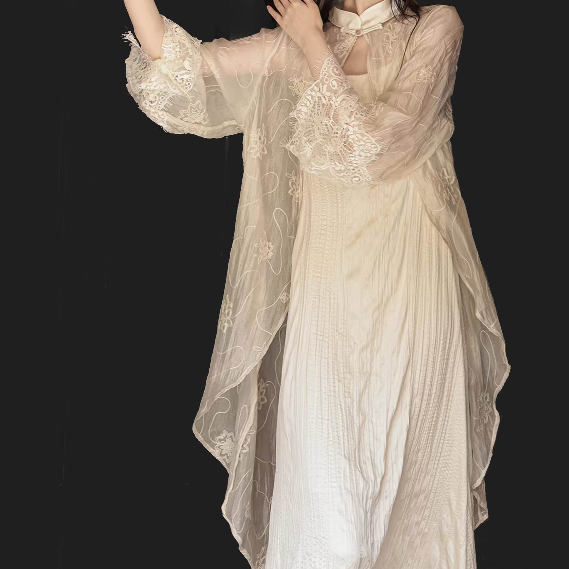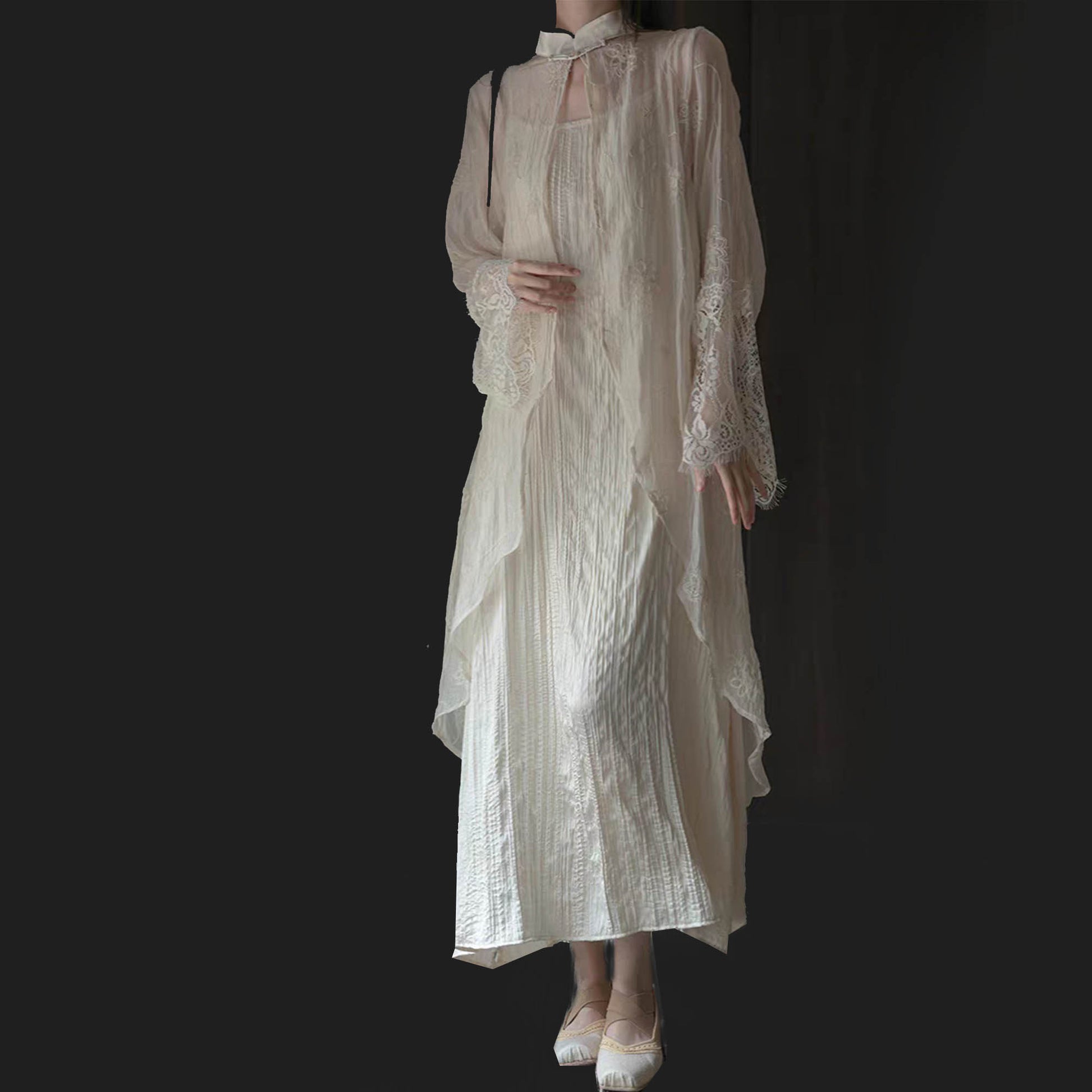 Sheer lace top with slip dress set lace fabric with stand collar and frog toggles closure at collar